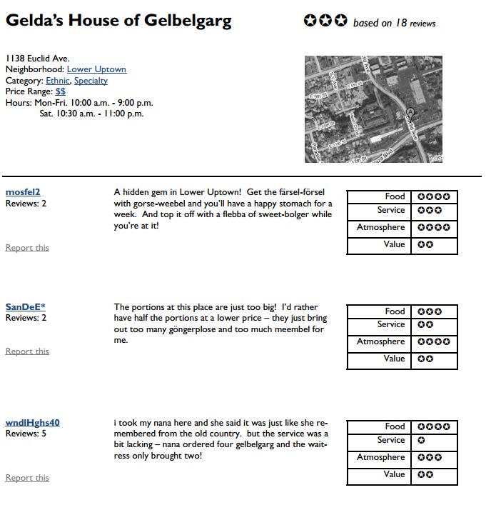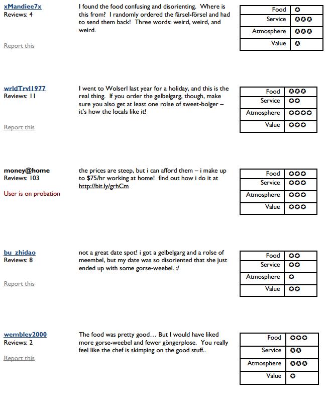 But the program doesn’t have to give up – instead, it can try to work out as much as it can. Various clues can tell a program whether something is a noun or a verb, a person or an inanimate object, etc., and you can even work out more! The following is a webpage where customers have rated their most recent experience at Gelda’s House of Gelbelgarg. Even if you’ve never heard of any of these dishes, you can still figure out some things about them…